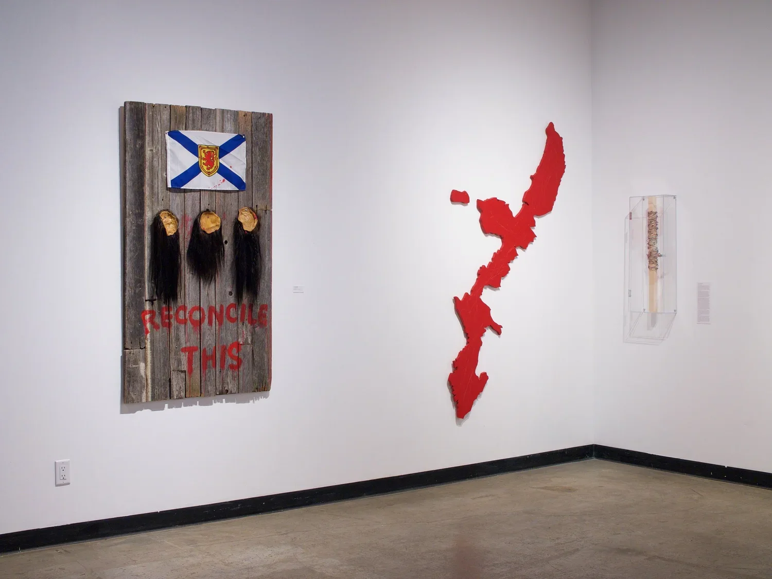 The exhibit Trumpet complements Dayna Danger’s work as it includes artwork that questions the contemporary political climate and encourages the public to consider stories and experiences that have been marginalized or excluded. For example, Kazumi Marthiesen’s “71 Swipes” comments critically on the history of American naval bases that are still located in Okinawa, Japan to this day and the sexual crimes that are still committed against Japanese women by American military personnel stationed there. Another work by Lee Deranger, entitled “Reconcile This” highlights how Nova Scotia’s history has failed to recognize indigenous perspectives or fully acknowledge the long-term effects of their mistreatment on indigenous communities today. The work depicts what appear to be three scalps of indigenous women that are tacked against a wooden door, with the Nova Scotian flag set above it, thereby calling attention to the harsh reality of indigenous women who are still murdered or going missing today.
