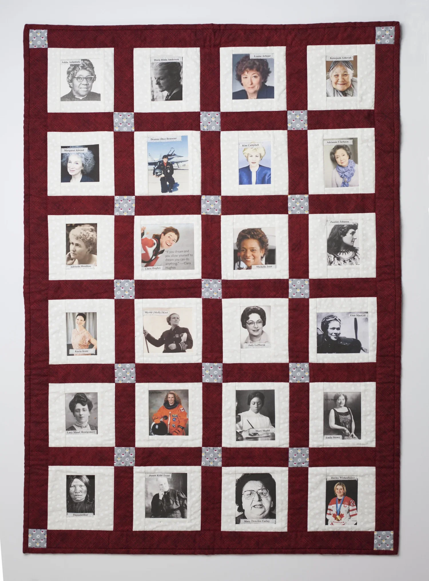 In contrast, the quilted work “Do You Know These Famous Canadian Women?” takes a broader societal scope to its subject matter by depicting famous Canadian women who have made an impact on Canada as a whole. Created by Ruth Walkden and Rose Brooks-Birarda, this work portrays several faces of Canadian women who have made their mark on Canada in various ways. These include women in a wide range of disciplines, such as anti-slavery activist, publisher, teacher, lawyer, and journalist Mary Ann Shadd, astronaut Julie Payette, Olympic gold medallist Hayley Wickenheiser, and notable Inuit artist Kenojuak Ashevak, among others. In a similar vein, Sheralee Hancherow’s “Never Give Up” portrays female athletes whose athletic achievements may not have been widely known. For example, her work mentions Chantal Petitclerc. the most decorated athlete in history, and Clara Hughes, who is the only athlete to have obtained multiple medals at both the Summer and Winter Olympics. Other works focus on historical events or developments that have impacted significantly on women’s lives and contributed to their independence and agency, such as Jan Peciulis’s “Women’s Suffrage” and Sharon Johnston and Jennie Wolter’s “The Pill.”