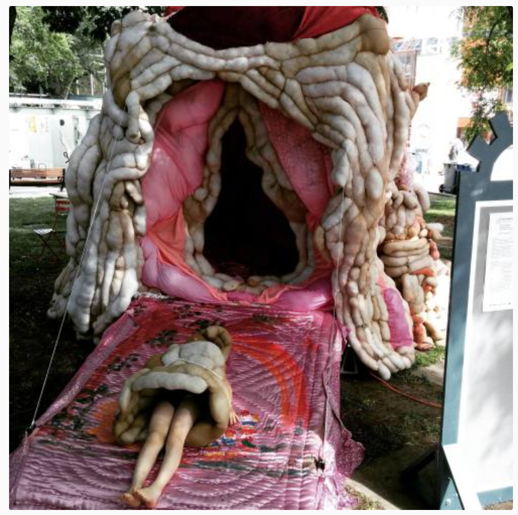 Kasie Campbell’s quietly momentous immersive installation is secluded in the small strip of grass, picnic tables and trees on the East side of the Square. Inside and Out sits like a squishy, wrinkled fleshy volcano, its skeleton a metal trailer, wheels engulfed by drooping girth. Inside and Out erupts with questioning and occasionally explosive patrons hourly. Despite of, or perhaps in spite of, the large vaginal looking entry into Inside and Out the piece feels surprisingly un-gendered, it feels uncomfortable and alive, it sits shaded, and dirty just outside the ring of conventional white cube gallery tents. Although soft, padded and cosy inside (its interior is lined with pillows and blankets) music pulses with a too-loud base, reverberating your chest and ringing your ears. Inside and Out, to me, has a queer reading of deep discomfort, of feeling trapped and controlled by your body, of having your flesh rebel. Through out the festival Kasie periodically performs with her child, Mav, both in costumes made from stuffed nylons, the same materials as the fleshy skin of the trailer. Kasie’s slowness oozes in comparison to Mav’s jerky childish motions, both are uncomfortable, and off-putting, they speak to me of repulsion of gender, and enforced identity based on physical attributes.