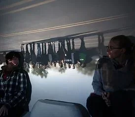 For those willing to enter the trailer, they may feel like nature photographers who blend into the landscape to take photos of wildlife. The trailer has a narrow chamber onto which a camera lens is affixed, so an image of Churchill Square is projected onto the trailer’s interior wall, but upside-down and backwards. People inside the trailer can watch what is happening on the square while hidden from view, much like watching a motion picture. However, nothing is photographed or recorded and everything is transient and observable only as a fleeting, site-specific moment. For Kern, then, Upside Down and Backwards functions as an “anti-camera” device because it is the opposite of what a camera does, which is to capture the past in still images.